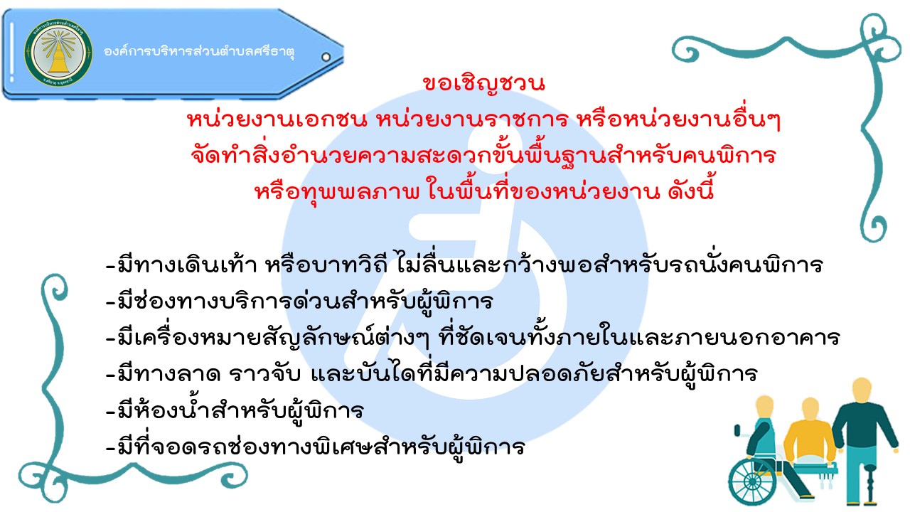 ประชาสัมพันธ์ ขอเชิญชวน หน่วยงานราชการ หน่วยงานเอกชน หรือหน่วยงานอื่น ๆ จัดทำสิ่งอำนวยความสะดวกขั้นพื้นฐานแก่ผู้พิการหรือทุพพลภาพ ในพื้นที่ของหน่วยงาน