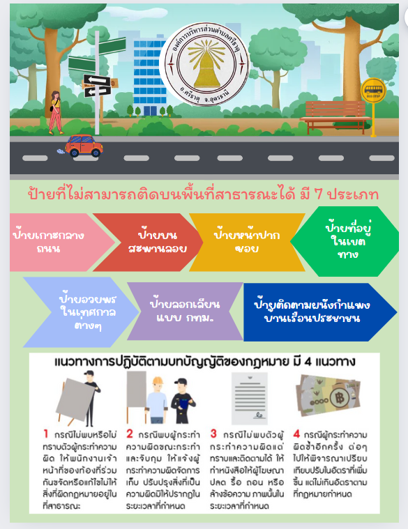 ** การกระทำอันเป็นการฝ่าฝืนกฎหมายเกี่ยวกับการติดตั้งป้ายโฆษณา หรือสิ่งอื่นใดที่รุกล้ำทางสาธารณะ กฏหมายเกี่ยวกับป้ายโฆษณาบนทางสาธารณะ ตามพระราชบัญญัติควบคุมอาคาร พ.ศ. ๒๕๒๒ กฎหมายเกี่ยวกับการก่อสร้างป้ายบนอาคาร และบนพื้นดินป้ายบนอาคารตามกฎหมายพระราชบัญญัติควบคุมอาคาร พ.ศ. 2522 มาตรา 4 (3) ป้าย หรือสิ่งที่สร้างขึ้นสำหรับติดตั้ง หรือตั้งป้าย (ก) ที่ติด หรือตั้งไว้เหนือที่สาธารณะ และมีขนาดเกินหนึ่งตารางเมตร หรือมีน้ำหนักรวมทั้งโครงสร้างเกินสิบกิโลกรัม (ข) ที่ติด หรือตั้งไว้ในระยะห่างจากที่สาธารณะ ซึ่งเมื่อวัดในทางราบแล้ว ระยะห่างจากที่สาธารณะมีน้อยกว่าความสูงของป้ายนั้น เมื่อวัดจากพื้นดิน และมีขนาด หรือน้ำหนักเกินกว่าที่กำหนดในกฎกระทรวง ตามกฎกระทรวงฉบับที่ 23 ( พ.ศ. 2533 ) ให้ป้าย หรือสิ่งที่สร้างขึ้นสำหรับติด หรือตั้งไว้ในระยะห่างจากที่สาธารณะ ซึ่งเมื่อวัดในทางราบแล้วระยะห่างจากที่สาธารณะ มีน้อยกว่าความสูงของป้ายนั้นเมื่อวัดจากพื้นดิน และมีขนาดความกว้างของป้ายเกินห้าสิบเซนติเมตร หรือยาวเกินหนึ่งเมตร หรือเนื้อที่ของป้ายเกินห้าพันตารางเซนติเมตร หรือมีน้ำหนักของป้าย หรือสิ่งที่สร้างขึ้นสำหรับ หรือติดตั้งป้ายอย่างใดอย่างหนึ่ง หรือทั้งสองอย่างรวมกันเกินสิบกิโลกรัมเป็นอาคารตาม มาตรา 4 กฎกระทรวงกำหนดสิ่งที่สร้างขึ้นอย่างอื่นเป็นอาคารตามกฎหมาย ว่าด้วยการควบคุมอาคาร พ.ศ. 2544 สิ่งที่สร้างอย่างอื่น ที่มีความสูงจากระดับฐานตั้งแต่ 10 เมตรขึ้นไป ตามกฎกระทรวง 55 ( พ.ศ. 2543 ) ข้อ 8 ป้าย หรือสิ่งที่สร้างขึ้นสำหรับติด หรือตั้งป้ายบนหลังคา หรือดาดฟ้าของอาคารต้องไม่ล้ำออกนอกแนวผนังรอบนอกของอาคาร และส่วนบนสุดของป้าย หรือสิ่งที่สร้างขึ้นสำหรับติด หรือตั้งป้ายต้องสูงไม่เกิน 6 เมตร จากส่วนสูงของหลังคา หรือดาดฟ้าของอาคารที่ติดตั้งป้ายนั้น ข้อ 13 ป้ายที่ติดตั้งอยู่บนดินโดยตรง ต้องมีความสูงไม่เกินระยะที่วัด จากจุดที่ติดตั้งป้าย ไปจนถึงกึ่งกลางถนนสาธารณะ ที่อยู่ใกล้ป้ายนั้นที่สุด และมีความยาวของป้ายไม่เกิน 32